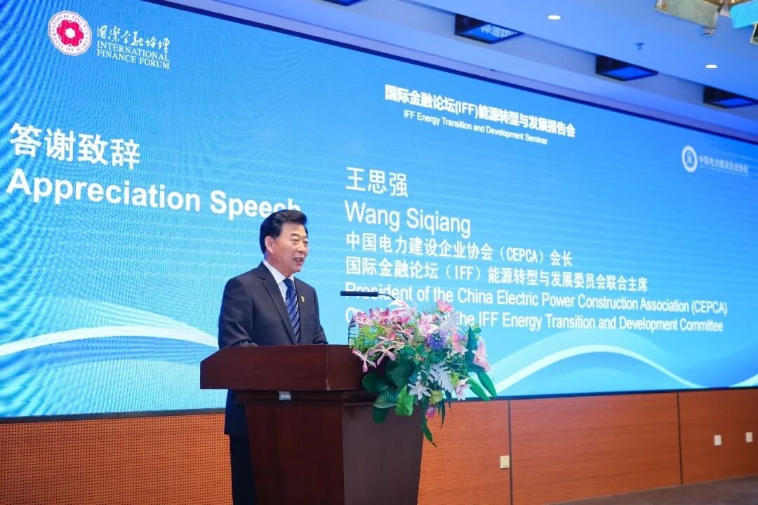 王思强在答谢致辞中对莅临会议的各位领导、嘉宾表示感谢,对支持中国电力建设高质量发展及全球能源绿色低碳转型发展的各界人士表示敬意。他表示,推动全球能源转型是一项伟大事业,中国电力建设企业协会将按照党中央国务院部署和电力建设行业的需要,在国际金融论坛(IFF)指导下,踔厉奋发、努力进取、开拓创新,为世界可持续发展注入新动能,为推动构建人类命运共同体、共创地球美好未来贡献中国力量。